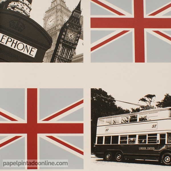 Descripción del producto: papel pintado de estilo inglés con toque antiguo, podrá encontrar la imagen de una de las principales atracciones turísticas de Londres, el Big Ben. Además de imágenes de autobuses clásicos y de las tan conocidas cabinas telefónicas, todas estas imágenes acompañadas en todo momento, por la bandera inglesa.
