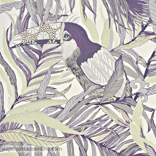 Descripción del producto: Papel Pintado con largas hojas acompañadas por dibujos de tucanes en color amarillo/verde, gris y morado.