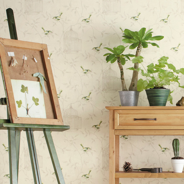 Descripción del producto: Papel Pintado de estampado floral, con ramas y jaulas dibujadas sobre un fondo beige y dibujos de pequeños pajaritos en color verde, amarillo y rosado.