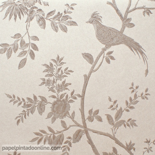 Descripción del producto: Papel Pintado con fondo dorado metalizado, con estampado floral y pájaros en beige y cava.